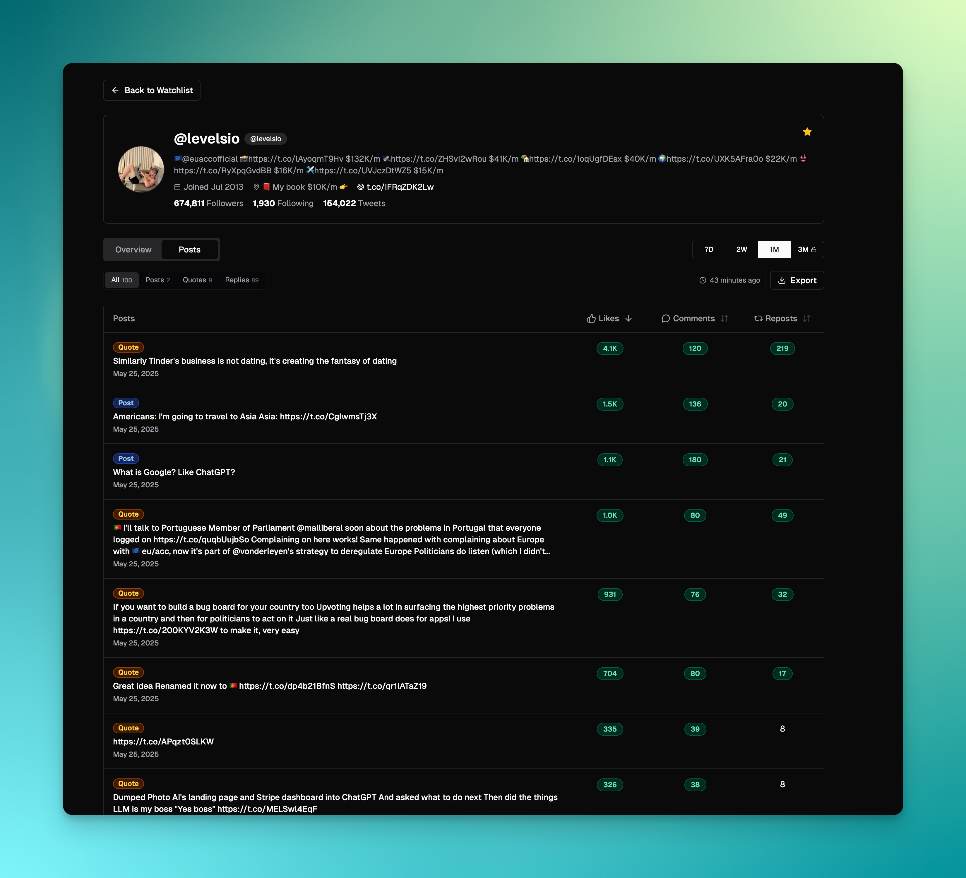 Create multiple watchlists - Organize by niche, competitor groups, inspiration sources, or any category that makes sense for you