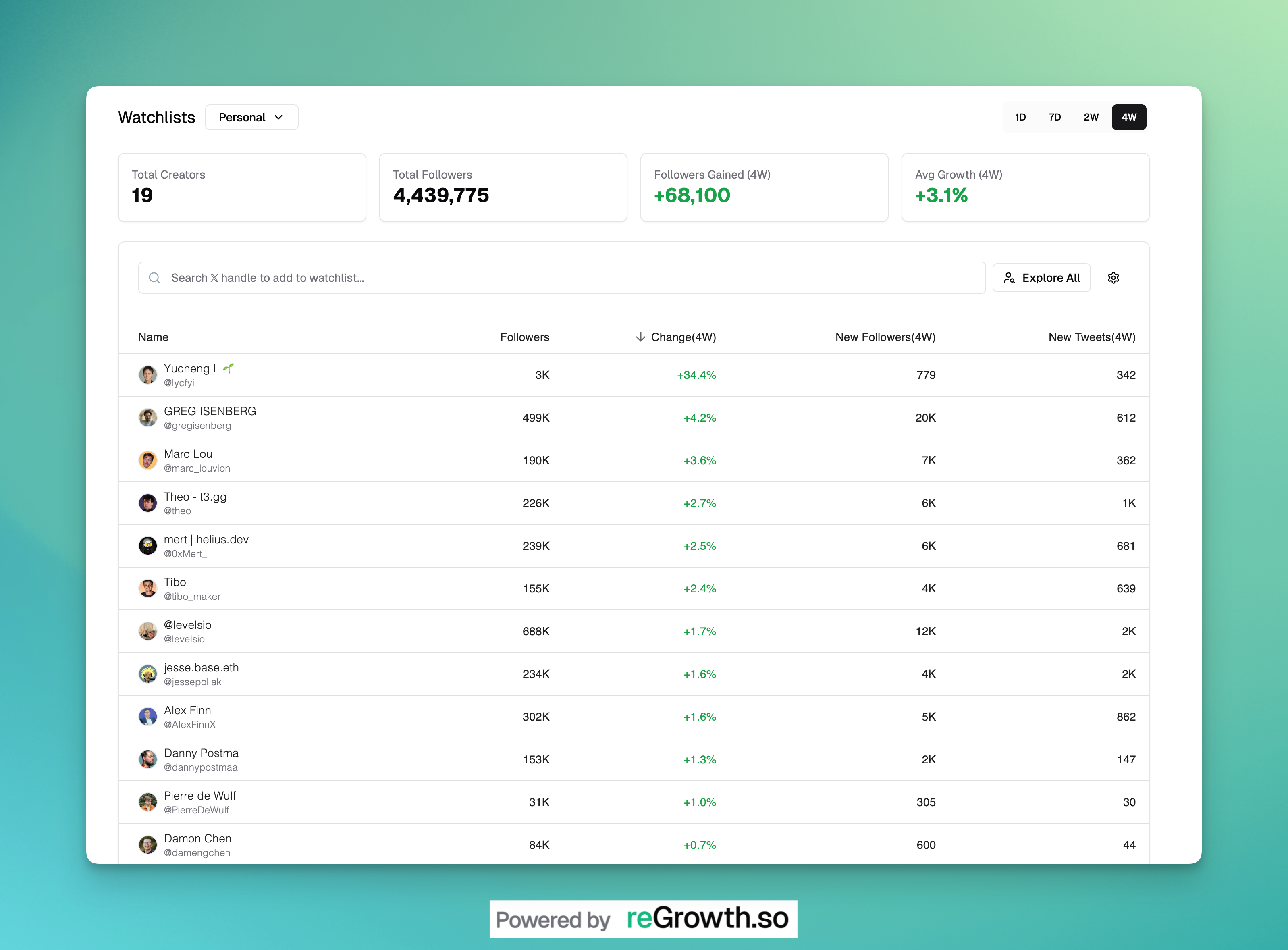 Sortable metrics: growth rate, engagement rate, posting frequency