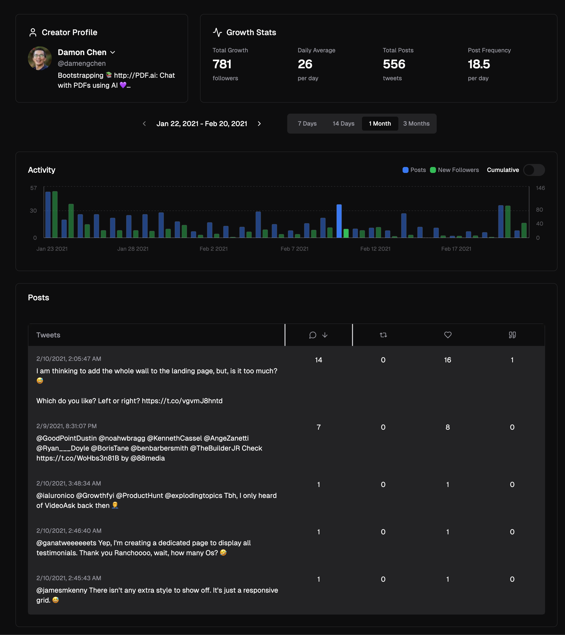 Interactive follower growth charts with cumulative/non-cumulative views